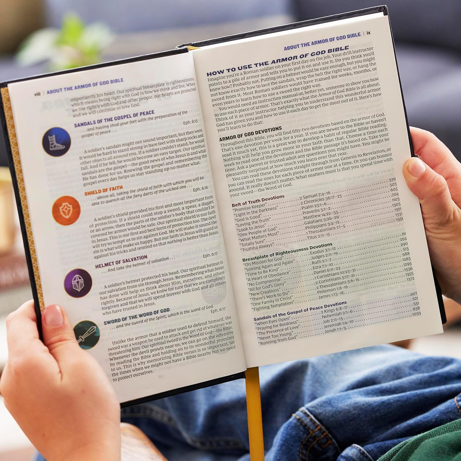 Devotionals and notes connect each piece of armor by icon to different verses throughout the Bible. In addition, numerous highlighted passages reinforce sharing their faith, encouragement to “be strong”, and note where spiritual and physical battles take place. All these features work together for your child to be grounded and find strength in the Word of God.