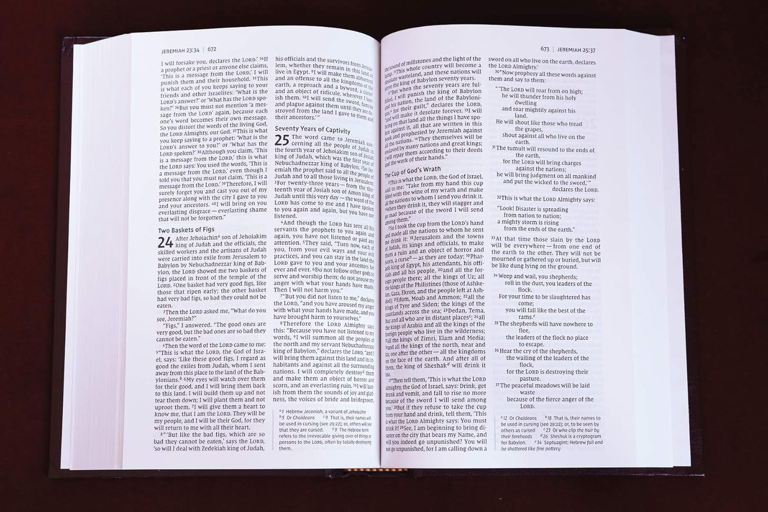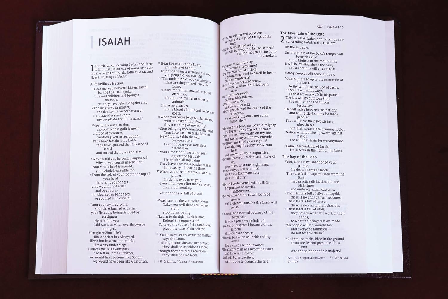 The NIV Pew and Worship Bible is ideal for any church or classroom and matches page-for-page with the NIV Preacher’s Bible. While both Bibles have their own distinct page layout, they were skillfully designed so that the pages of these two different Bibles begin and end with the same word. This will allow pastors and congregations to be on the same page during sermons.